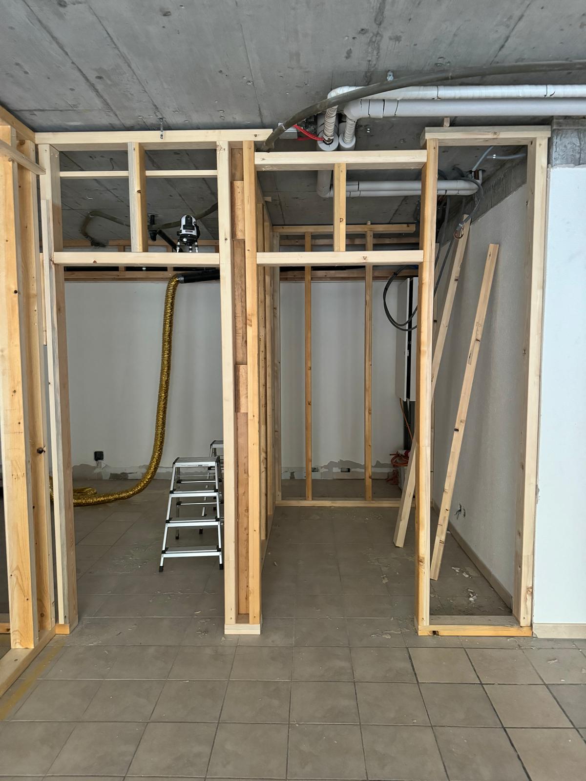 - Einbau von Plättli und neuen Trennwänden aus Holz